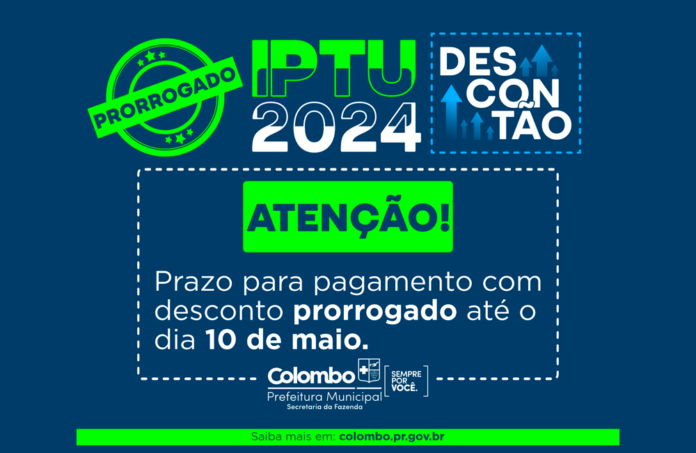 Fique atento para o novo prazo! Para pagamento em Cota Única, o contribuinte deve acessar o link https://colombo.atende.net/autoatendimento/servicos/guias-de-iptu/detalhar/1 e solicitar a fatura do IPTU 2024 do seu imóvel.